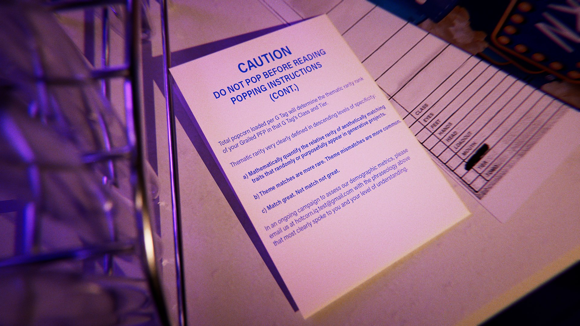 You have the option to load popcorn onto your G-tag. The type and quantity of popcorn you choose will determine the faction of your pfp along with the traits.