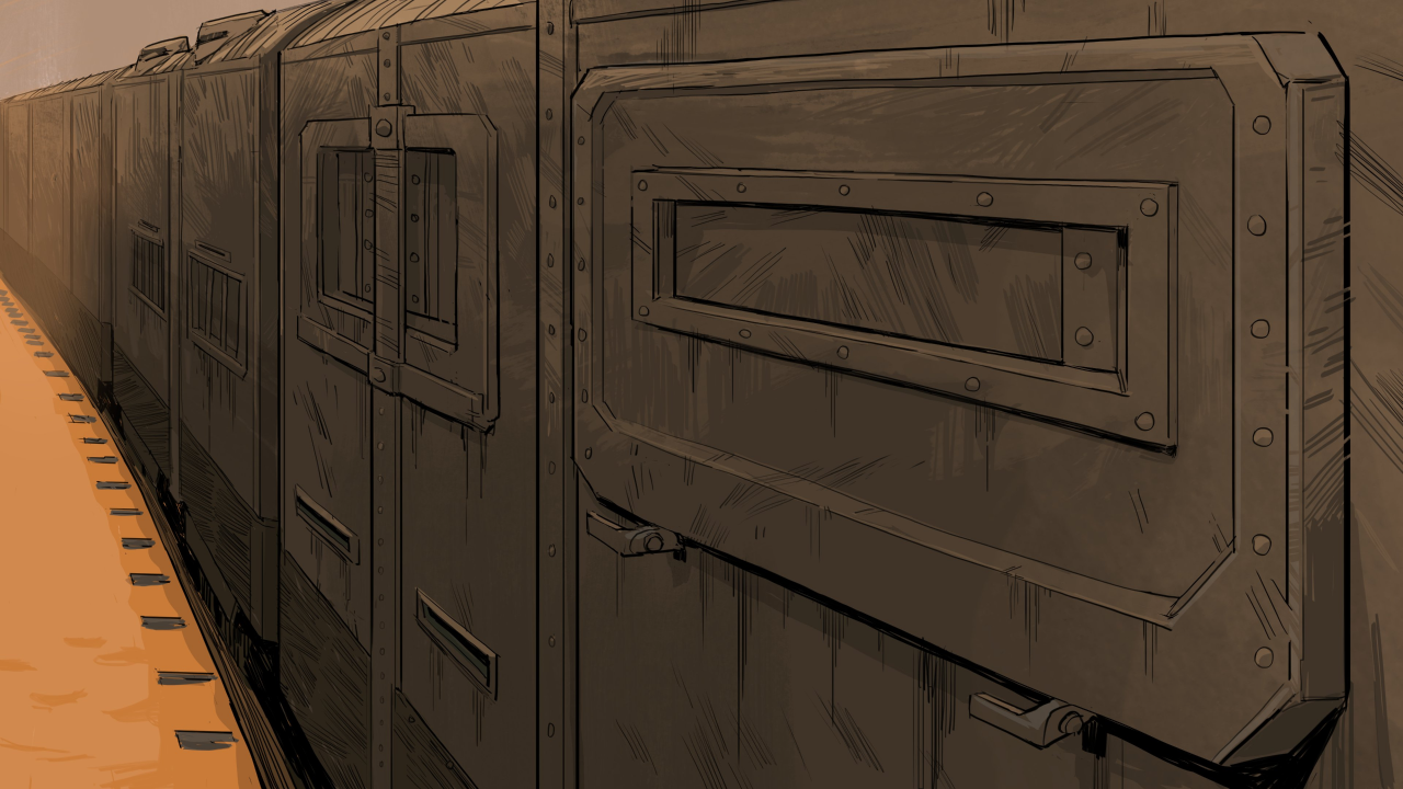 The train traveled through the desert under the bright sun. Strange creatures with red eyes looking through the windows...